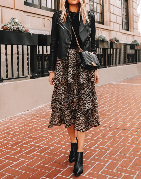 Le noir s’accorde évidemment bien au léopard, à condition que votre look soit pensé avec de jolies pièces fortes. Evitez la robe noire moulante avec des escarpins léopard ou la mini-jupe léopard avec un haut noir moulant et très décolleté au risque de renvoyer l’image d’un look quelque peu vulgaire…
