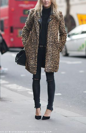 Le manteau est LA pièce forte en léopard. Pour autant, il n’est pas forcément évident de le porter, l’idée étant d’éviter à tout prix le look « bourgeoise » ou « vieille rombière » ! Ainsi il doit être associé à des pièces basiques, simples et épurées. Portez-le sur un jean bleu ou gris foncé, un tee-shirt ou une chemise blanche et des boots noires. Portez-le également sur un total look noir ; un slim ou un tailleur pantalon avec la veste ceinturée.