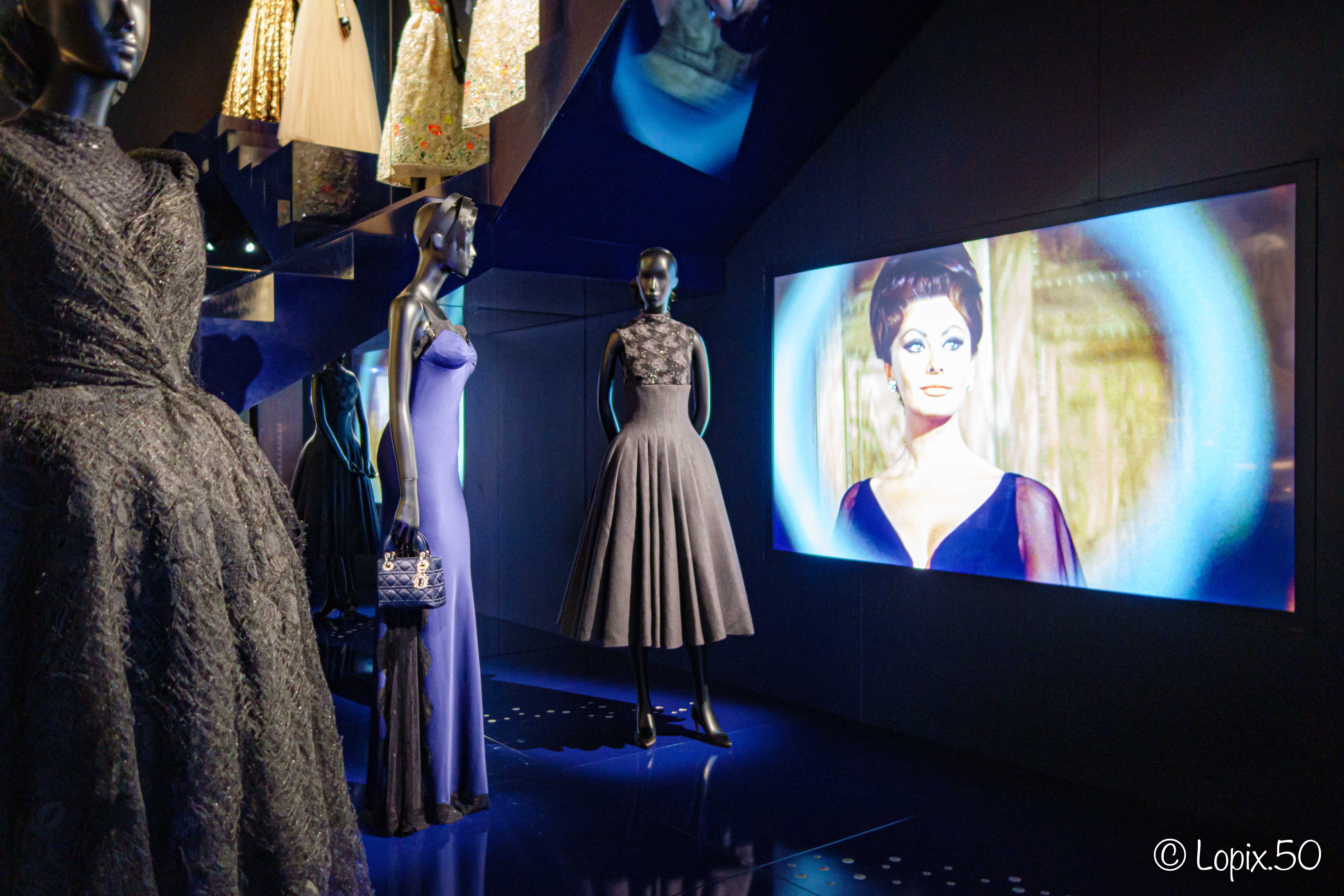 De salle en salle, le visiteur voyage dans le temps au gré des inspirations et des créations de la Maison Dior. L’on voit les nombreuses stars habillées en Dior dans des classiques du cinéma projetés sur écran, parfois à côté de la robe elle-même, des centaines de couvertures de magazines, jusqu’aux flacons de parfum.