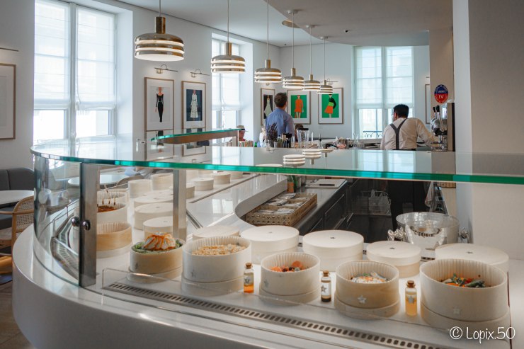 La visite s’achève par le Café Dior, sorte de sas de « retour dans le présent » , avant de quitter définitivement la Galerie. Calme et sobrement décoré, le Café offre la possibilité de clôturer la visite par une pause gourmande. Il est également possible d’y feuilleter quelques livres iconiques sur la Maison Dior.