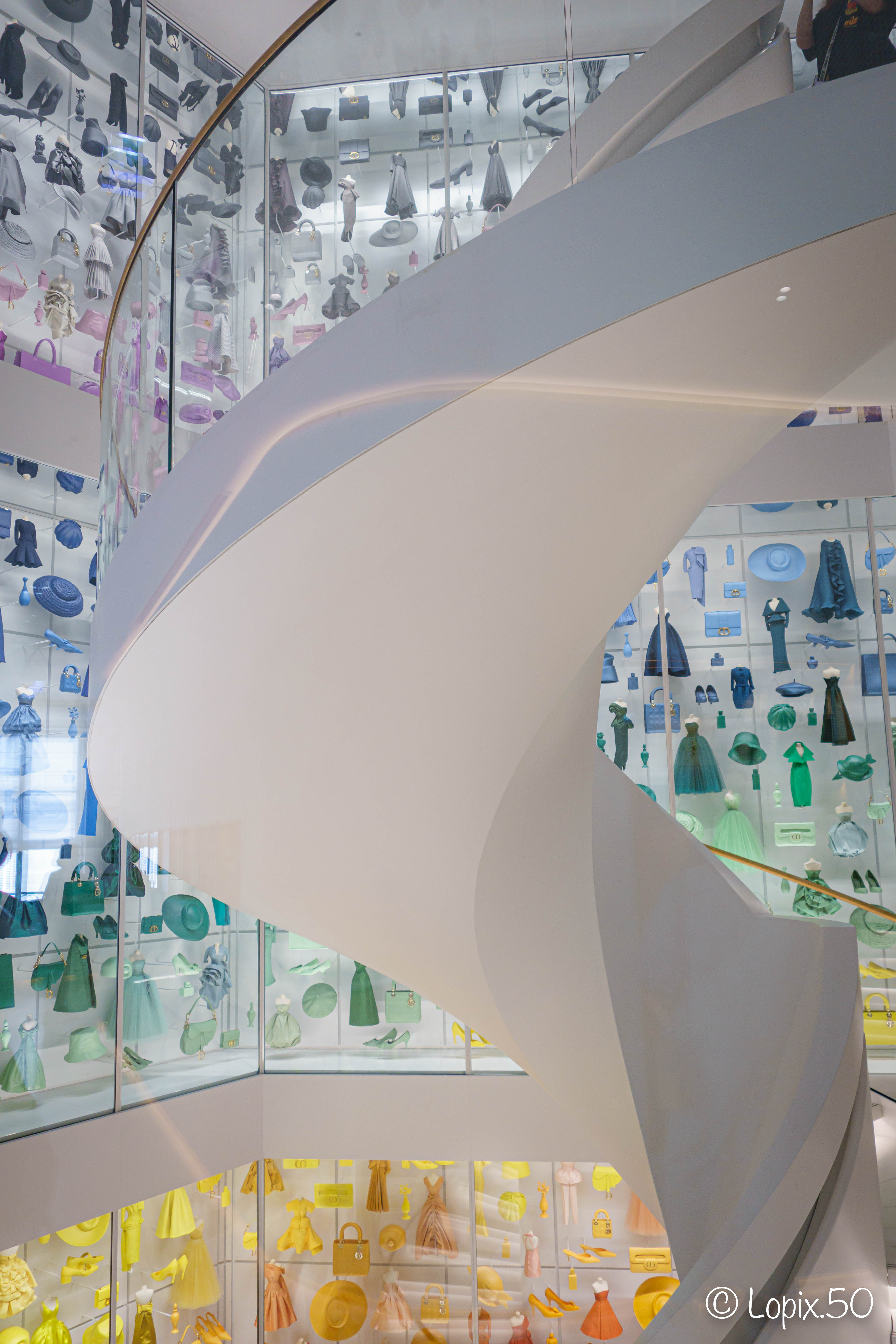 Dès l’entrée, un vertigineux escalier en colimaçon surplombé d’une vitrine hors norme abrite robes miniatures et objets iconiques imprimés en 3D, tout en camaïeux de couleurs. Le ton est donné : celui d’un voyage étourdissant dans l’univers de la Maison Dior.
