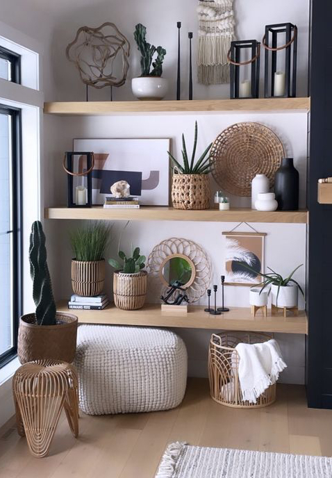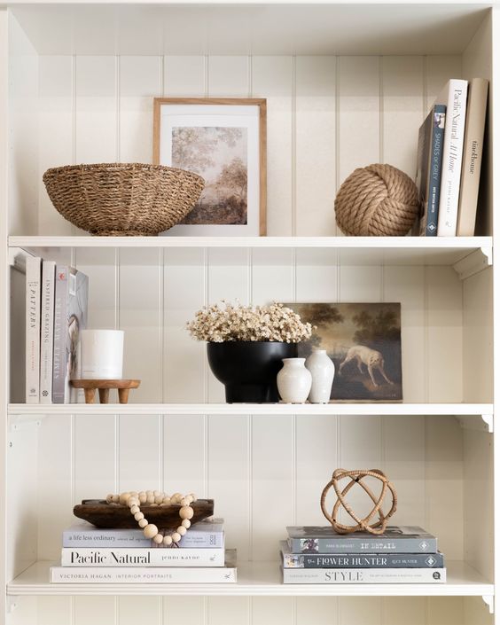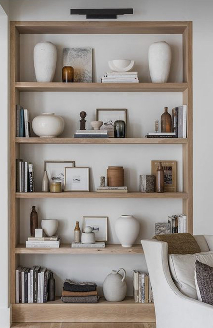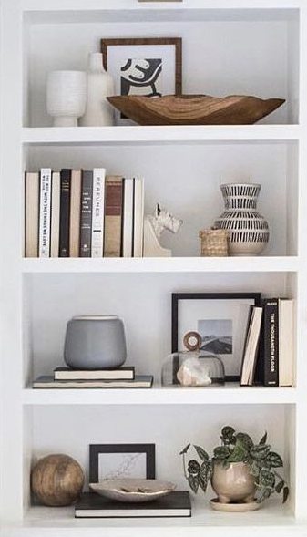 ✧ Jouez avec les textures. Incorporer une variété de matériaux et de textures (bois, pierre, métal, cire, livres, plantes, etc.) contribue à ajouter de la profondeur à un espace. Cela évite qu’à l’œil les étagères paraissent plates.