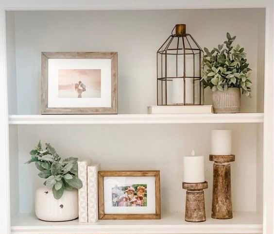 Si en revanche vous n’avez que des petits objets, mettez-les en valeur en ajoutant, par exemple, un cadre plus grand derrière eux (photo, aquarelle, oeuvre d’art, etc.), en les empilant sur des magazines ou des livres.