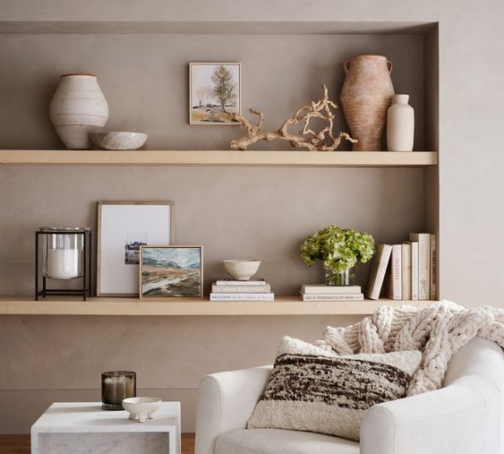 Composer, équilibrer et harmoniser une étagère flottante ou un meuble étagère relève de quelques principes.