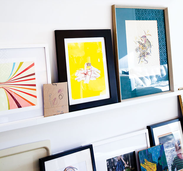 Une tablette mince ou une cimaise peut être agrémentée d’une galerie de photos ou d’œuvres d’art. Une tendance toujours actuelle qui change de la galerie de cadres fixée au mur.