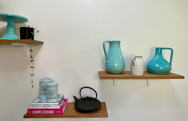 Comme dans de nombreux intérieurs, mon salon accueille un meuble bibliothèque ainsi que plusieurs étagères flottantes, dont des tablettes de radiateur. Si mes étagères de bibliothèque sont en grande partie occupées par des livres, certaines restent des espaces vacants, sur lesquelles je mêle essentiellement souvenirs de voyage et petites céramiques.